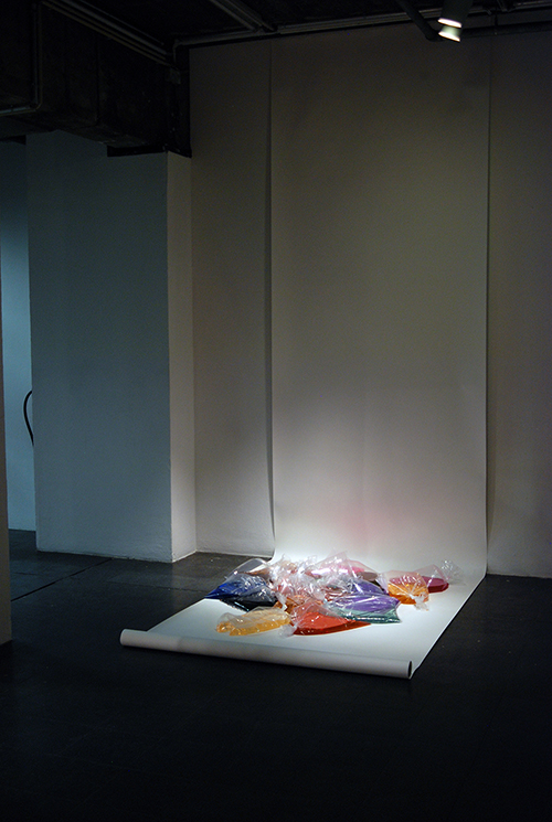 Die flüchtige Materialität meiner Setzungen – bestehend aus losem Pigment, farbigem Licht und farbigen Flüssigkeiten – entwickeln ein vielschichtiges Spiel körperlicher Wahrnehmungen und verwandeln den Raum in eine komplexe Licht-Farb-Bewegung, die die Begrenzungen der architektonischen Fixierungen visuell aufzulösen scheinen.